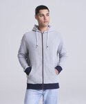 Long sleeve regenerated cotton zoodie with brushed inner and peached outer face. Features include set-in sleeves, contrast rib at cuffs hem, full length front zip and kangaroo pocket. Vegan certified. BSCI certified. Oeko-Tex certified. SEDEX certified.